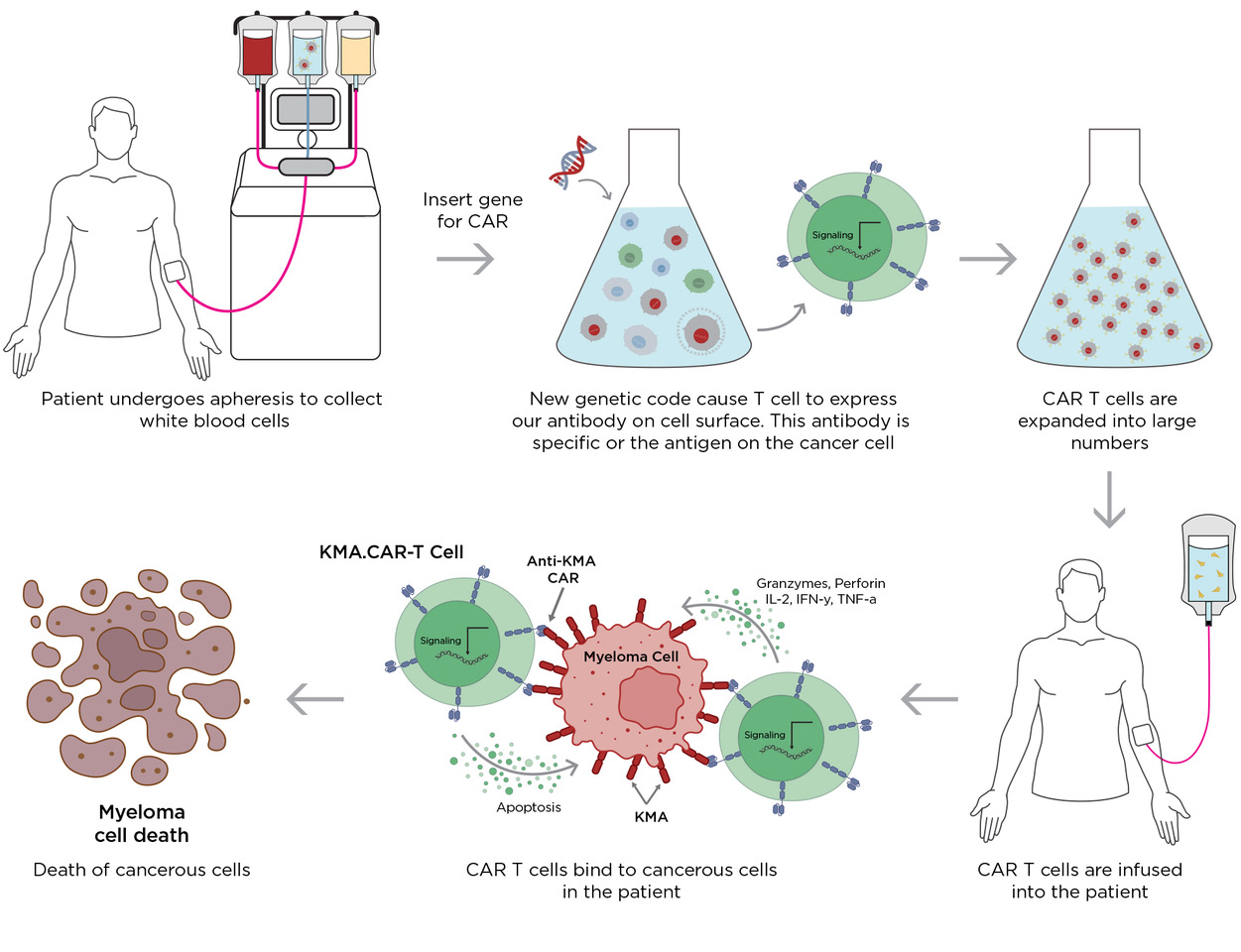 In the treatment of multiple myeloma patients, the T cells are harvested from the patient’s blood and then genetically engineered in the laboratory to create KMA.CAR-T cells. These cells will then be grown and expanded to create millions of KMA.CAR-T cells, which are infused back into the patient as a “living drug”. CAR-T cells hunt down, bind to and directly kill the myeloma cells that express the relevant target. They survive in the patient’s body and continue to destroy any myeloma cells as they multiply.