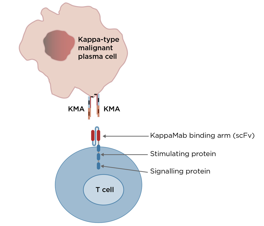 HaemaLogiX, in collaboration with clinical researchers at the Westmead Institute of Medical Research, NSW, Australia, created the KMA.CAR-T cell by genetically engineering T cells so that the binding arm or “single chain variable region fragment”; (scFv) of KappaMab is expressed and presented on the surface of the T cell. As shown in the figure below, the binding arm of KappaMab is connected to two proteins inside the T cell that are capable of stimulating and signalling to the T cell that it should destroy the KMA-positive myeloma cell.